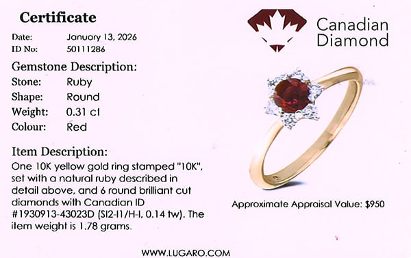 10K yellow gold flower halo ring featuring a 0.14 carat round brilliant cut Canadian diamond, accented 0.31 carat ruby.