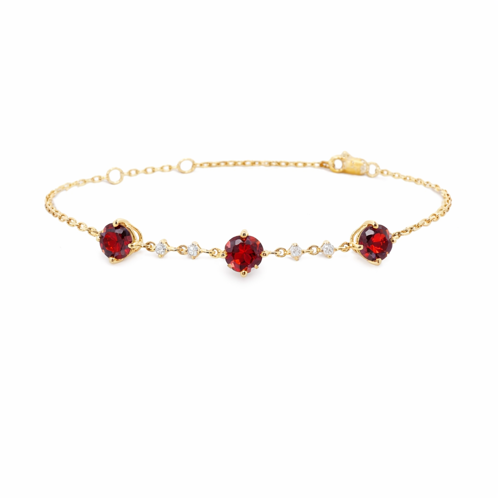 10K yellow gold dainty chain bracelet featuring 1.85 carat total weight garnet, accented by 0.08 carat total weight Canadian diamonds.