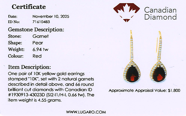 Dangle earrings includes a Canadian diamond certificate.