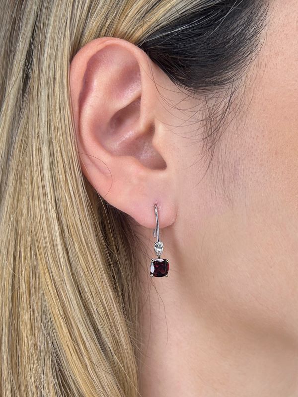 10K gold drop earrings featuring 0.20 carat total weight round brilliant cut Canadian diamonds, accented by 2.42 carat total weight cushion cut garnet.