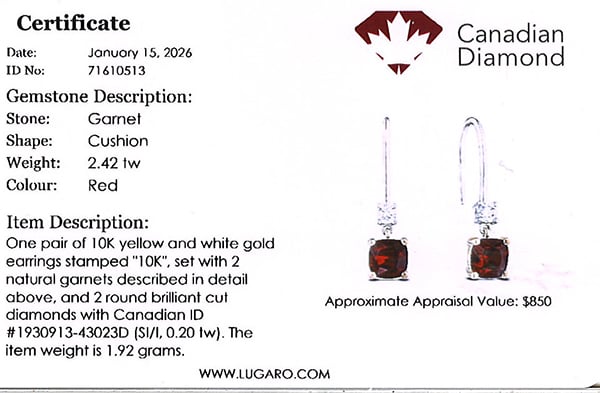 Drop earrings includes Canadian diamond certificates.