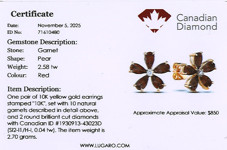 10K yellow gold stud earrings featuring 2.58 carat total weight garnet, accented by 0.04 carat total weight round brilliant cut melee Canadian diamond.