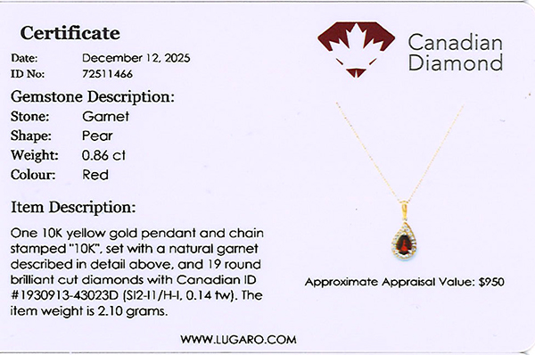Halo pendant includes a Canadian diamond certificate.