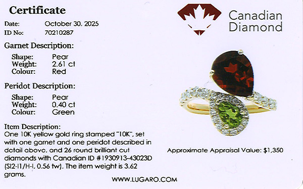 10K yellow gold halo diamond ring featuring 2.61 carat pear shape garnet , accented by 0.40 carat peridot and 0.56 carat total weight round brilliant cut melee Canadian diamonds.