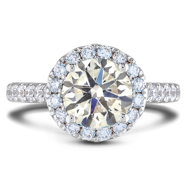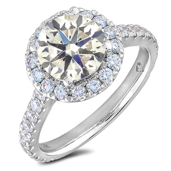 18K white gold classic diamond halo engagement ring featuring 2.25 carat ideal round brilliant cut GIA diamond, accented by 0.83 carat total weight round brilliant cut diamonds around the crown and along the shank.