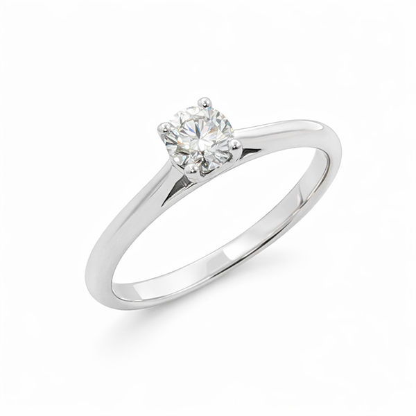 14K white gold engagement ring featuring a 0.32 carat round brilliant cut GIA certified diamond.