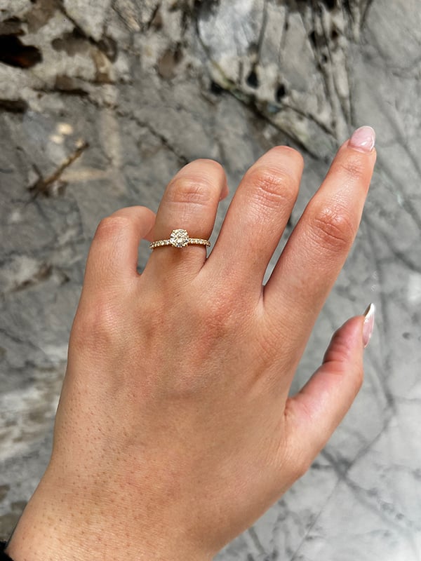 14K yellow gold ring featuring a 0.71 carat round brilliant cut GIA diamond, accented by 0.29 carat total weight round brilliant cut diamonds.