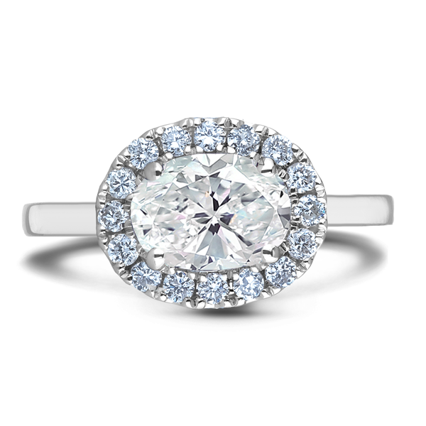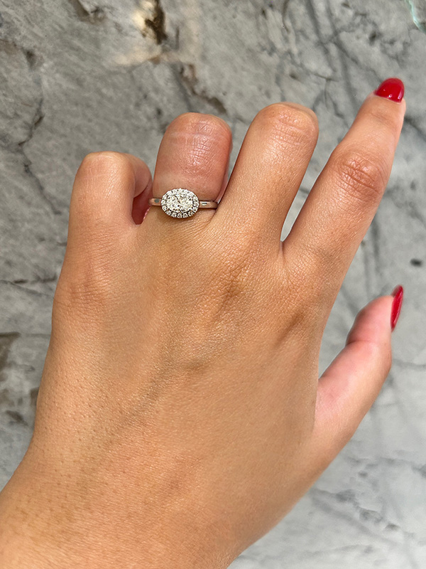 18K white gold halo ring featuring a 1.00 carat oval shaped GIA diamond.