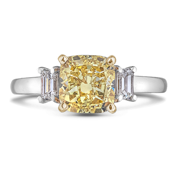 18K white and yellow gold trilogy diamond engagement ring featuring a 2.25 carat fancy intense yellow cushion modified brilliant cut GIA certified diamond, accented by 0.32 carat total weight emerald cut De Beers Forevermark diamonds.