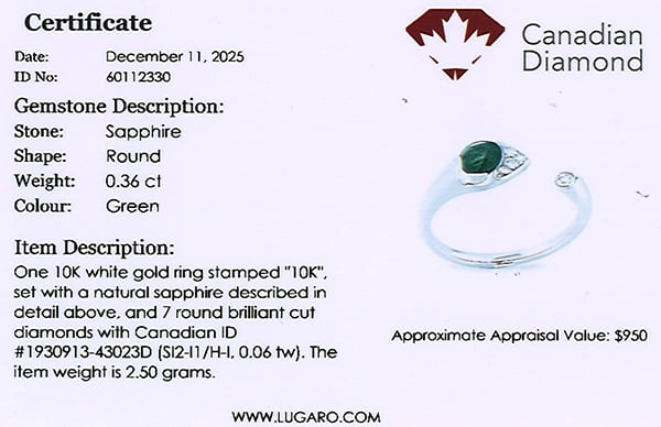 10k yellow gold ring features 0.06 carat total weight round brilliant cut Canadian diamond, accented by 0.36 carat green sapphire.