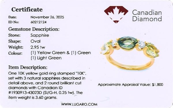 10k yellow gold ring featuring 2.95 carat total weight green sapphires, accented by 0.25 carat total weight round brilliant cut Canadian diamonds.