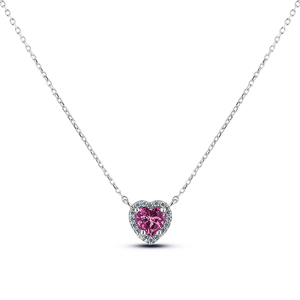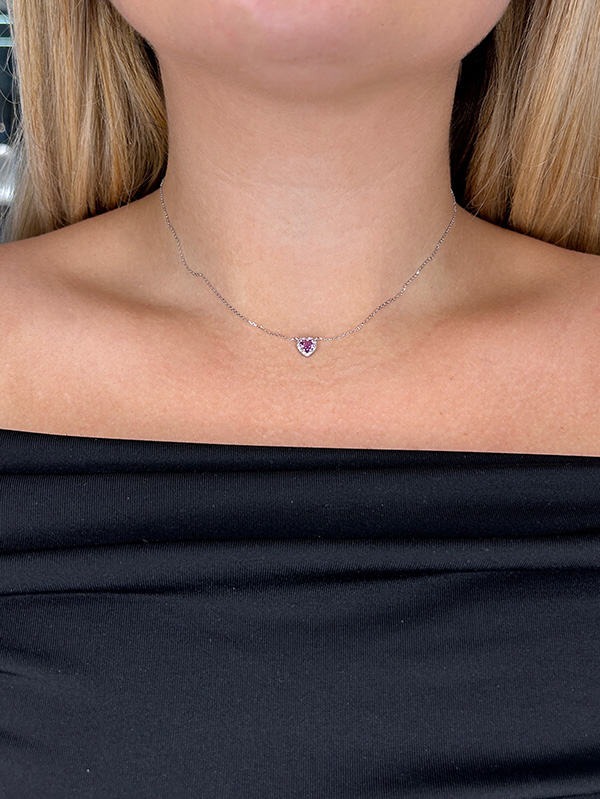 10K white gold heart shape halo pendant featuring a 0.60 carat pink sapphire, accented by 0.06 carat total weight round brilliant cut diamonds.