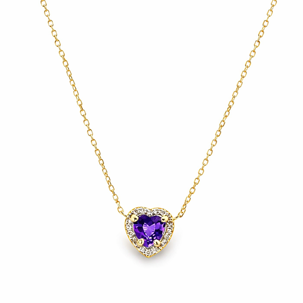 10K yellow gold heart necklace featuring 0.71 carat total weight heart shaped natural amethyst, accented by 0.08 carat total weight round brilliant cut diamonds.