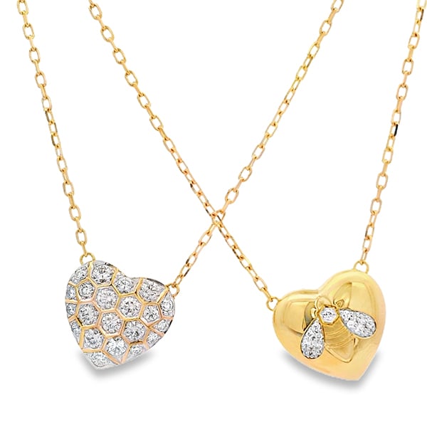 Pendant features two beautifully crafted sides one showcasing a sparkling honeycomb design set with diamonds, and the other side a detailed bee motif accented with diamonds.