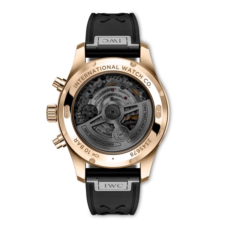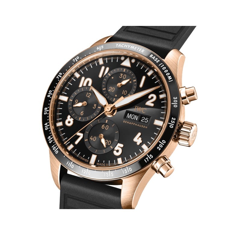 The Pilot’s Watch Performance Chronograph 41 features a case made of 18-carat 5N gold, a black lacquered dial, and gold-plated hands and appliques.
