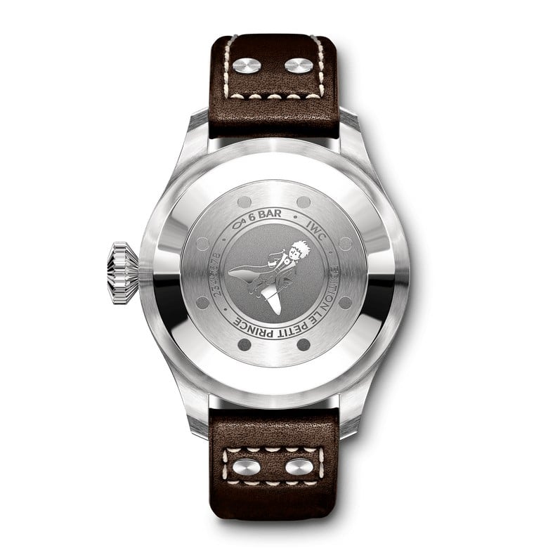 The 46-millimetre Big Pilot’s Watch Edition Le Petit Prince features the characteristic blue dial which has become the signature trademark of IWC’s special editions in tribute of Antoine de Saint-Exupery’s most famous literary work. The watch is powered by the IWC-manufactured 52110-calibre movement. It features an efficient Pellaton automatic winding system with parts made from black or white ceramic. With the help of two barrels, it builds up a reserve of 7 days. The display at 3 o’clock provides an indication of the remaining power reserve. The Big Pilot’s Watch has a date display at 6 o’clock and the central seconds essential in any watch used for flying. With its soft-iron inner case, it is optimally shielded against the influence of magnetic fields. This Pilot’s Watch has an engraving on the rear of the little prince with his cape and sword.