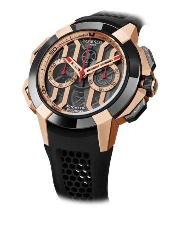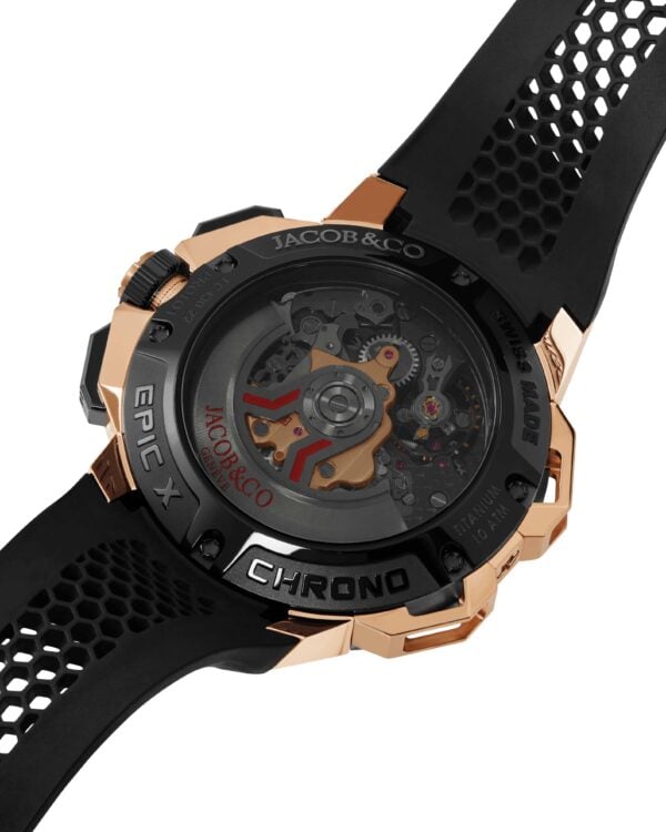 The Epic X is a collection defined by its unmistakable design, contemporary style and high-end watchmaking solutions. Every Epic X is a statement-piece: a bold combination of traditional and high-tech materials, exclusive and highly refined calibers, and a truly Epic aesthetic that is immediately recognizable and yet remarkably versatile. From sporty and rugged to precious and elegant, every Epic X is as striking as it is multifaceted. Defined by the iconic X-shaped lugs and dial appliqués, the Epic X Chrono 44MM features integrated design-, and engineering solutions for ultimate comfort, functionality and style. Its complex case is full of details, lending it its unique aesthetic and inimitable feel. The smoked mineral crystal dial and case-back allow for a peek into the Exclusive JCAA05 chronograph caliber and its finished details. The open-worked rubber straps allow for ventilation and flow seamlessly into the lugs and case-band, all to create a comfortable fit on the wrist. Following up on the enduring appeal of the 47-mm versions, Jacob & Co. went on to create a 44-mm Epic X Chrono subcollection. This alternative case size opens up the Epic X Chrono to a new crowd, seduced by Jacob & Co.’s unique design features in a universally wearable, definitely unisex format.