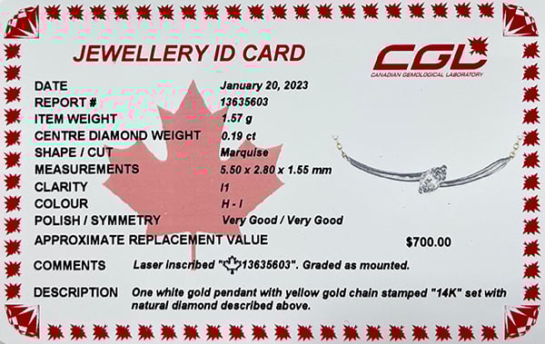 14K white and yellow gold solitaire Canadian diamond thunderbolt necklace featuring a 0.19 carat marquise cut diamond. Necklace includes Canadian Gemological Laboratory certificate.