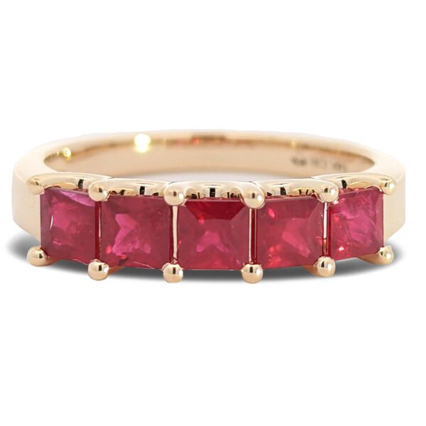 14K yellow gold 5-stone ruby anniversary wedding ring featuring 5 = 1.33 carat total weight princess cut ruby.