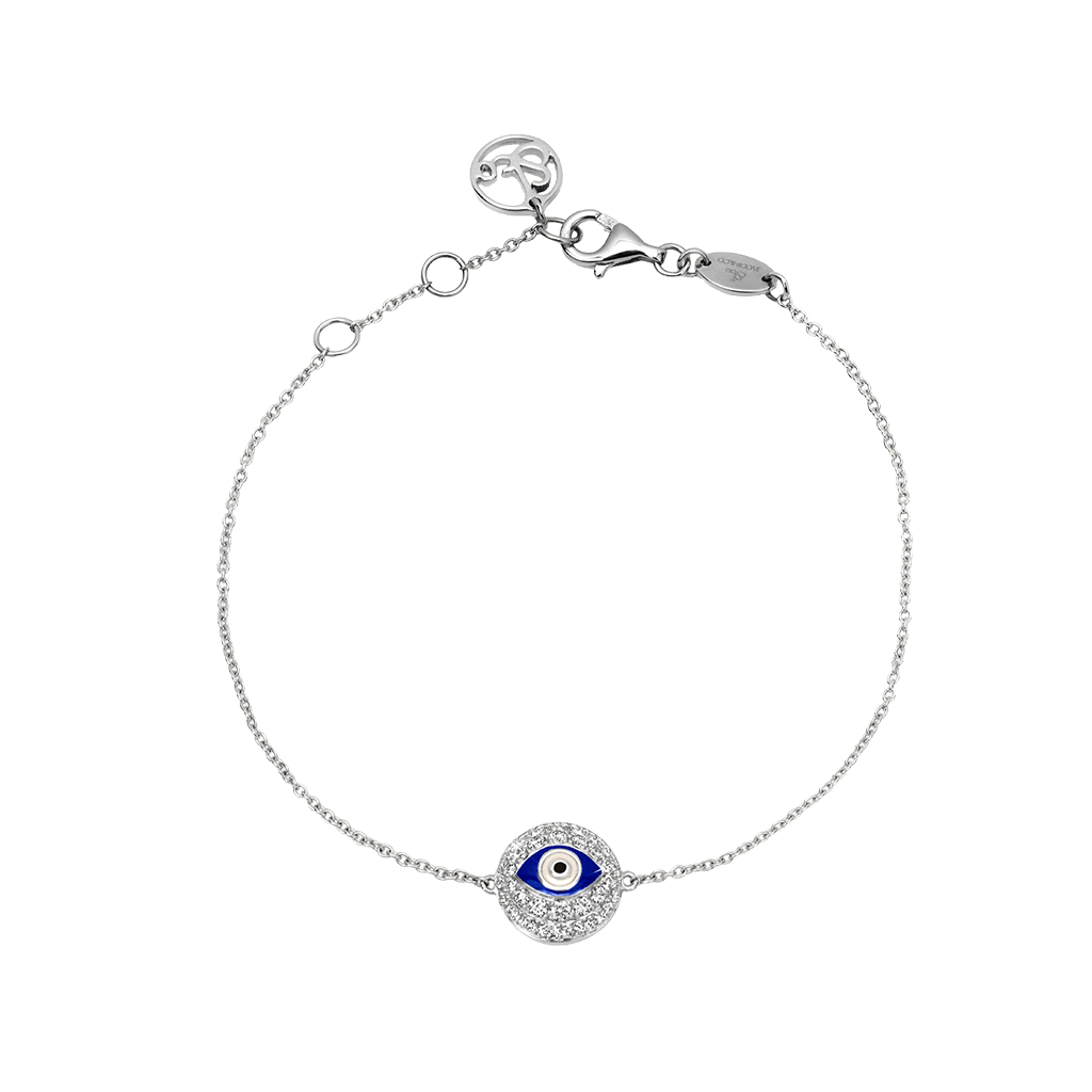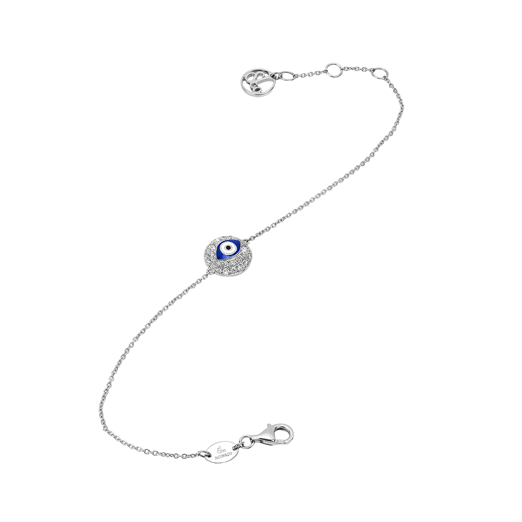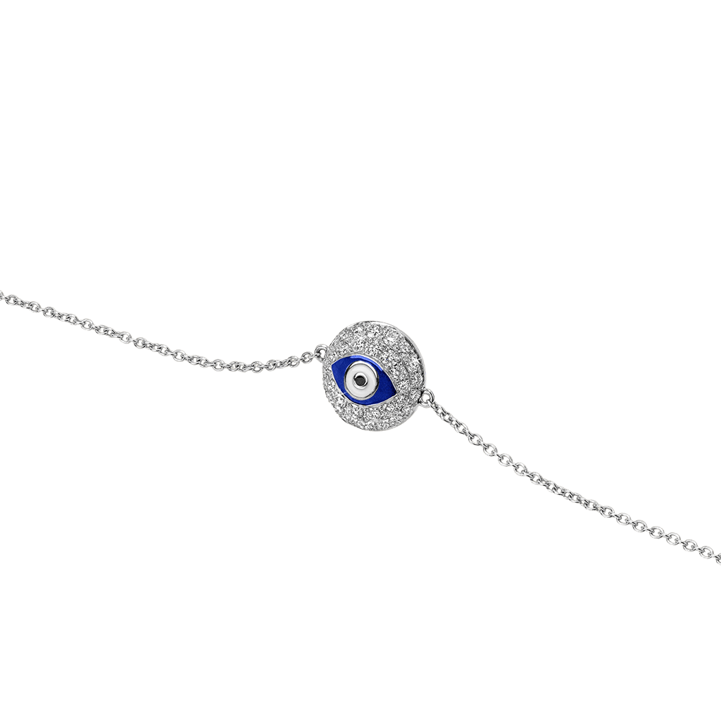 Jacob & Co. Evil Eye Bracelet with 0.35ct Pave Set White Round Brilliant Cut Diamonds (32 Stones, F-G Color/VS Clarity) and Blue Enamel Eye on 18cm Gold Chain. Diamond: Weight: 0.35 ct, Clarity: VS2, Color: G, Shape: RB, Quantity: 32. Metal: Type: White Gold, Quality: 18K, Weight: 2.7 Grams, Size: 18cm.