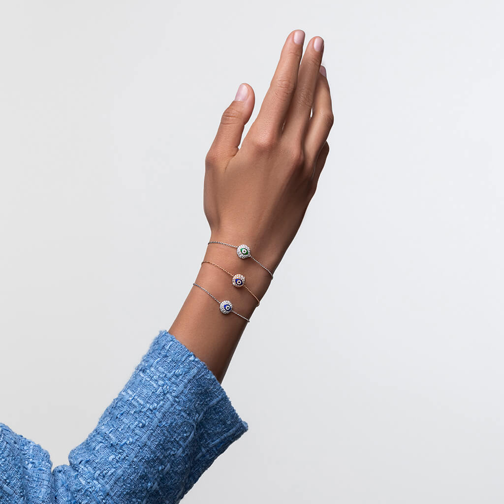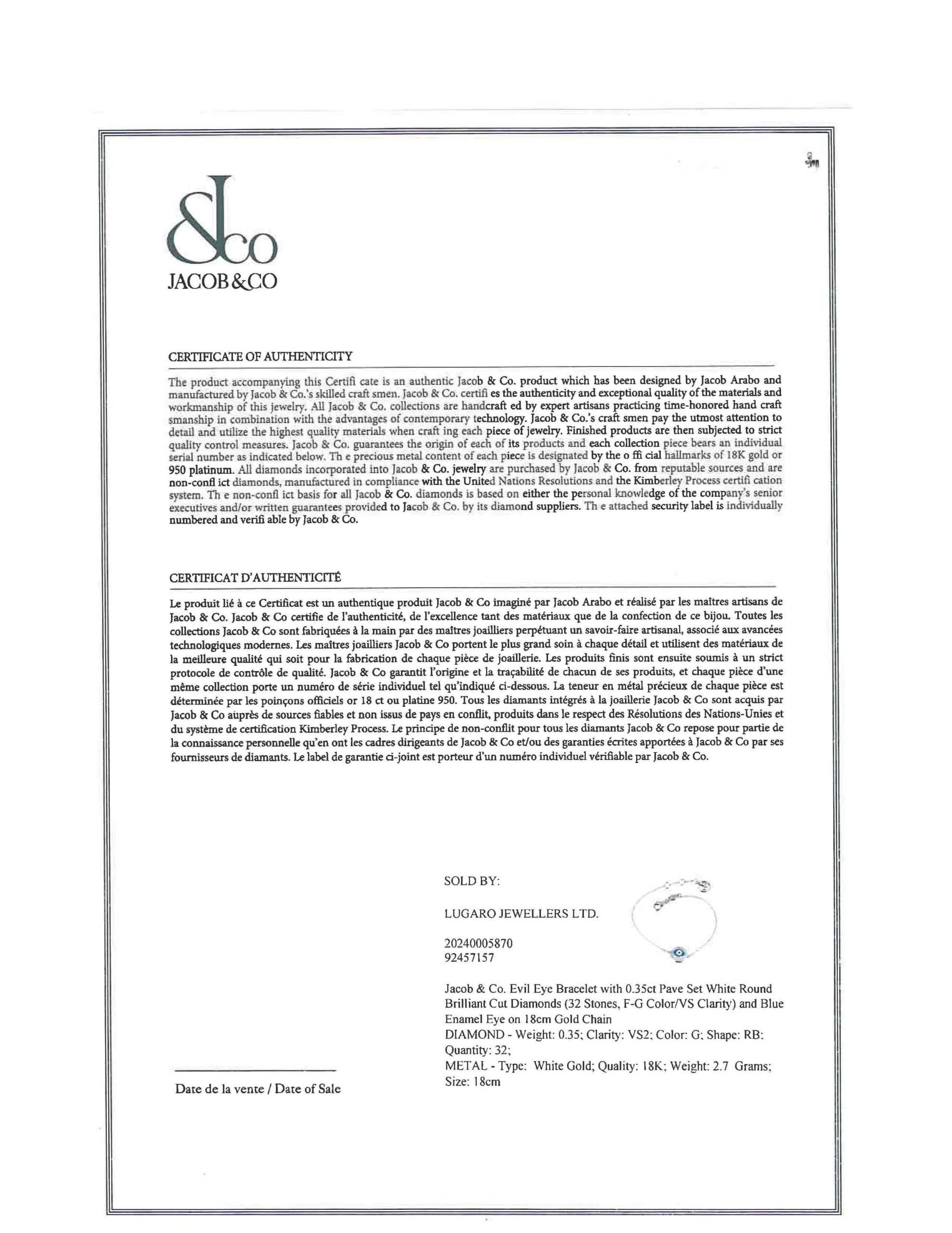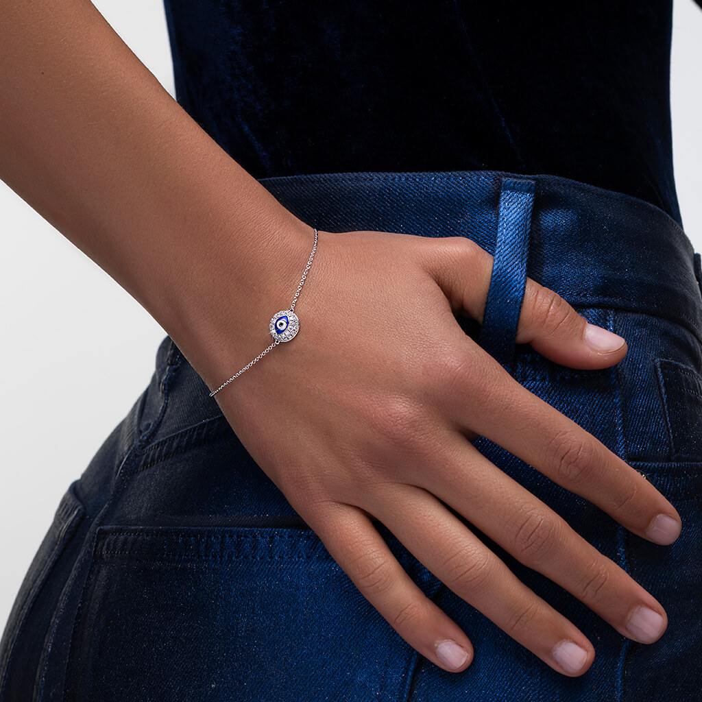 Jacob & Co. Evil Eye Bracelet with 0.35ct Pave Set White Round Brilliant Cut Diamonds (32 Stones, F-G Color/VS Clarity) and Blue Enamel Eye on 18cm Gold Chain. Diamond: Weight: 0.35 ct, Clarity: VS2, Color: G, Shape: RB, Quantity: 32. Metal: Type: White Gold, Quality: 18K, Weight: 2.7 Grams, Size: 18cm.