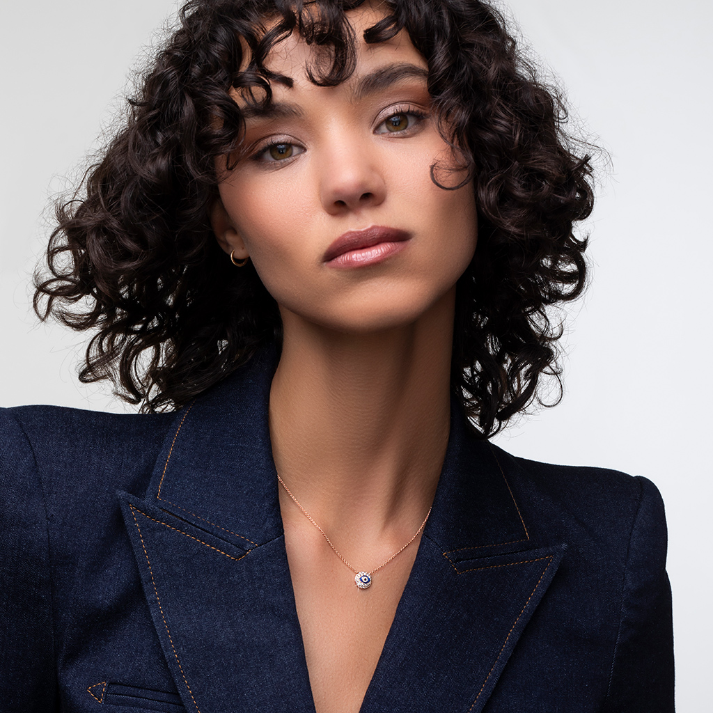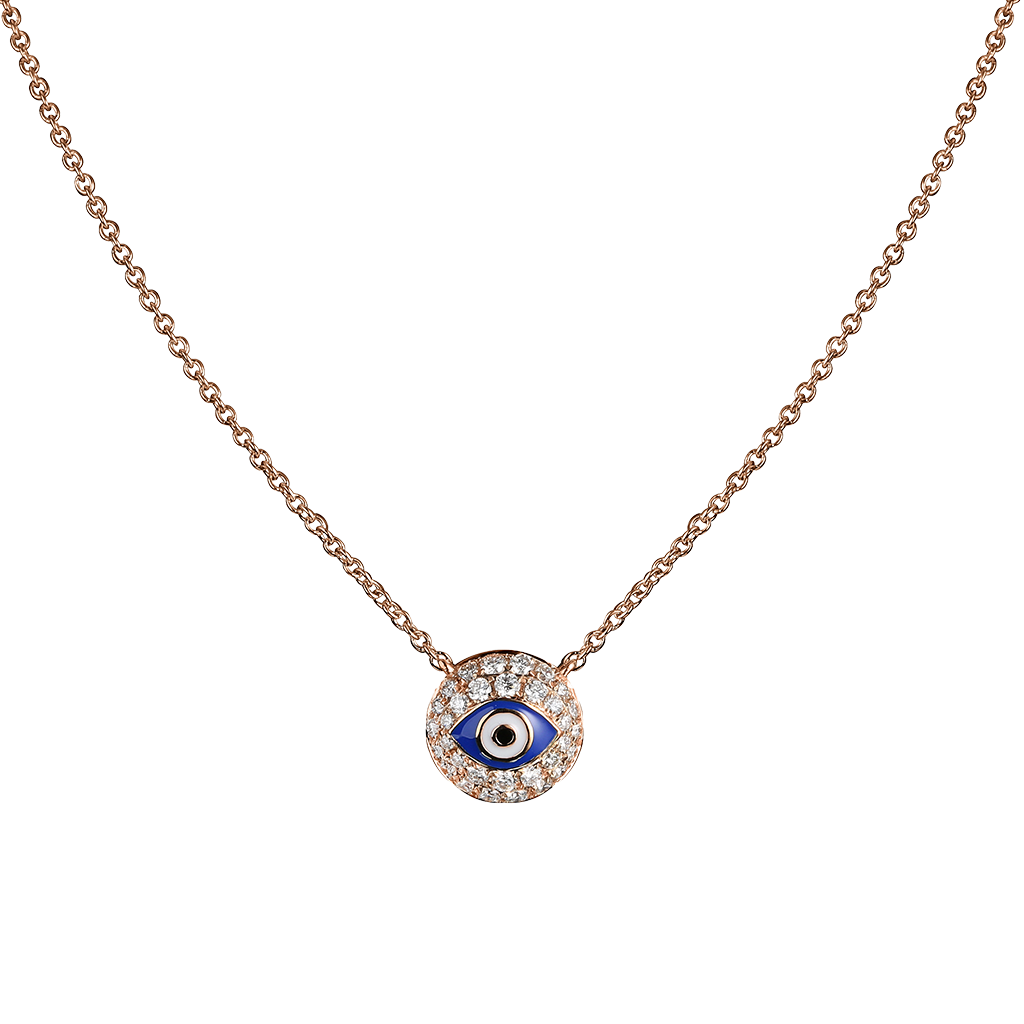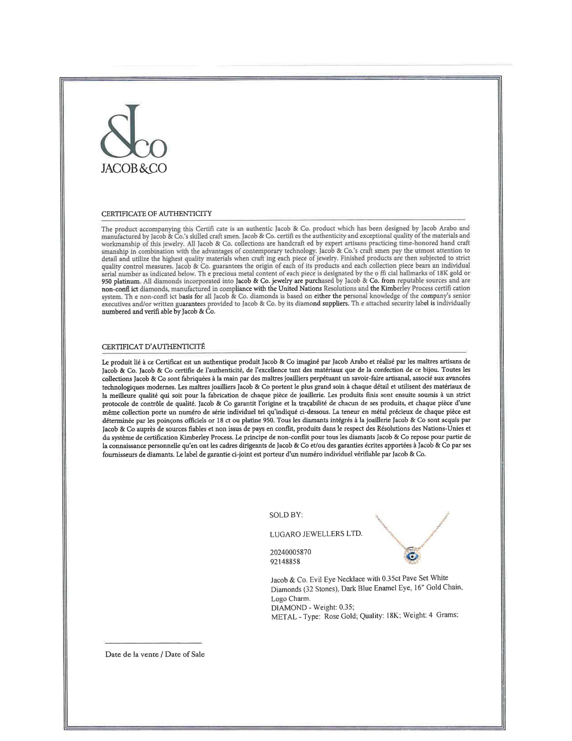 Jacob & Co. Evil Eye Necklace with 0.35ct Pave Set White Diamonds (32 Stones) Dark Blue Enamel Eye, 16″ Gold Chain, Logo Charm. Diamond: Weight: 0.35 ct. Metal: Type: Rose Gold, Quality: 18K, Weight: 4 Grams.
