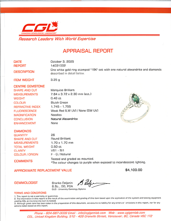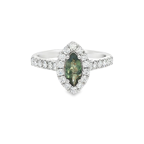 Be the first to review “Marquise Shaped Alexandrite and Canadian Diamond Halo Ring in 18K White Gold”
