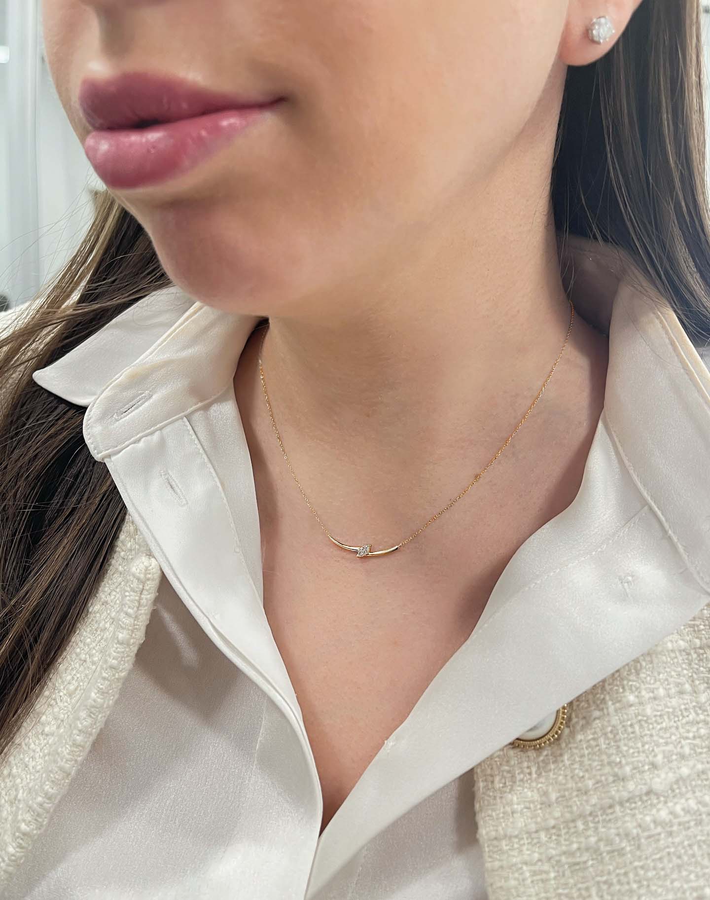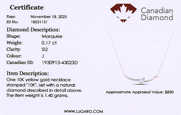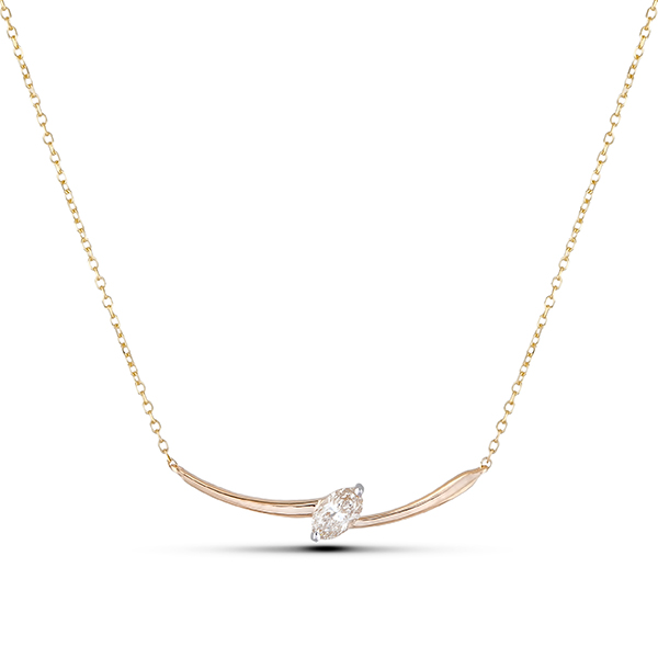 10K yellow gold necklace featuring a 0.17 carat marquise cut diamond.