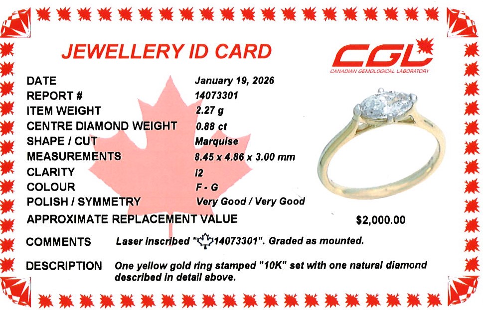 10K yellow gold ring featuring a 0.88 carat Canadian diamond.
