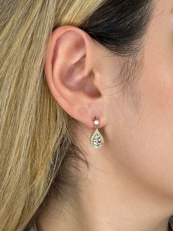 10K yellow gold drop earrings featuring 1.18 carat total weight pear cut morganite, accented by 0.42 carat total weight round brilliant cut Canadian diamonds.