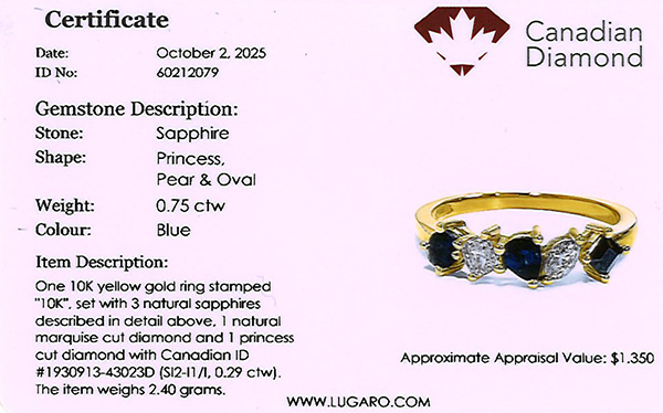 10K yellow gold ring featuring 0.75 carat total weight sapphire, accented by 0.29 carat total weight Canadian diamonds.