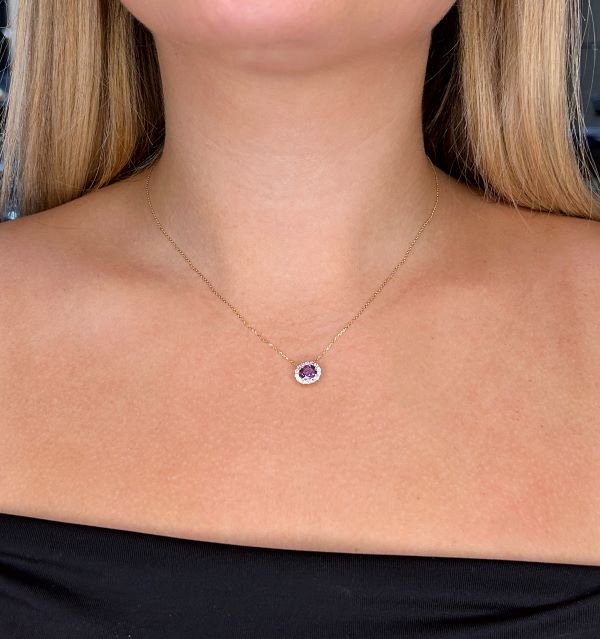 10K yellow gold unheated oval purple sapphire and Canadian diamond halo pendant featuring a 0.82 carat oval cut sapphire, accented by 0.20 carat round brilliant cut Canadian diamonds.