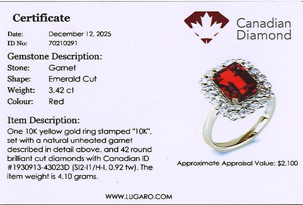 Double halo cocktail gemstone ring includes Canadian Gemological Laboratory Certificate.