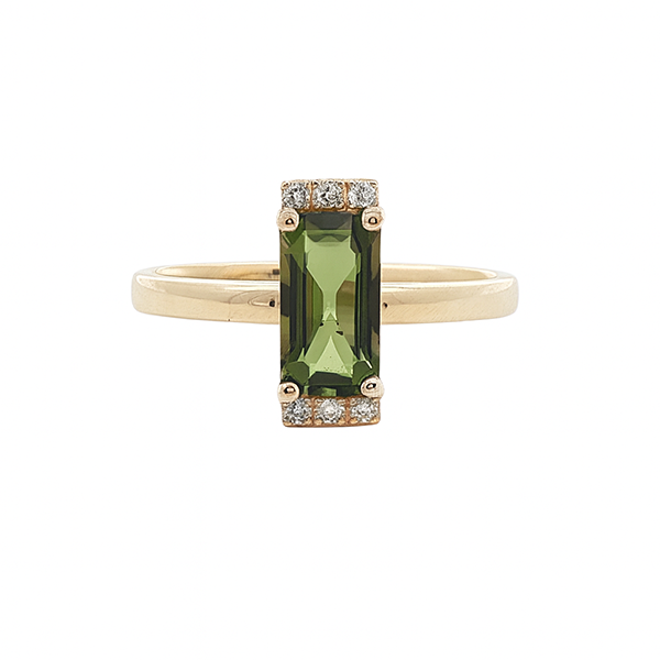 10K yellow gold ring featuring a 1.05 carat unheated green sapphire, accented by 0.06 carat total weight round brilliant cut Canadian diamond.