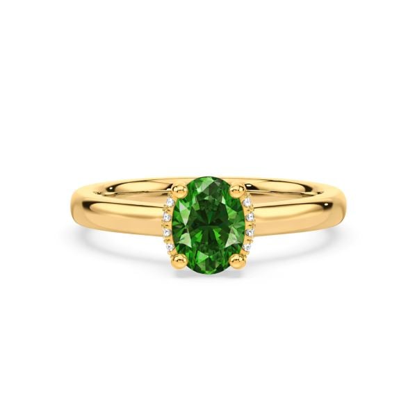 10K yellow gold green sapphire with hidden diamond halo ring featuring 1.41 carat oval shaped unheated green sapphire, accented by 0.04 carat total weight round brilliant cut diamonds.