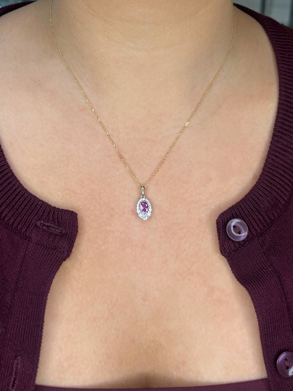 Be the first to review “Non Heated Pink Sapphire and De Beers Forevermark Diamond Halo Pendant in 14K Gold”