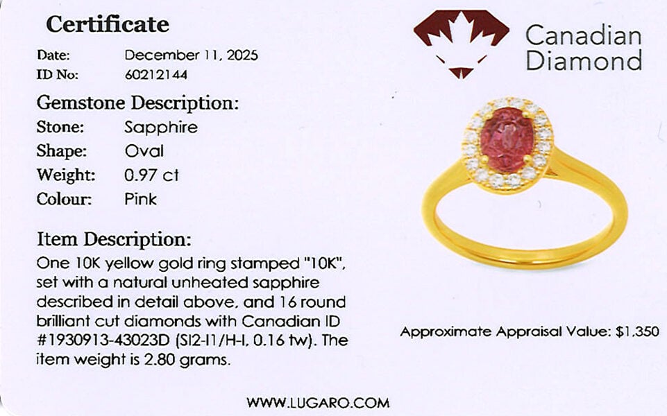 10K yellow gold ring featuring a 0.97 carat unheated pink sapphire, accented by 0.16 carat total weight round brilliant cut melee Canadian diamonds.