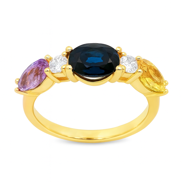 10k yellow gold ring featuring 2.86 carat total weight unheated sapphires, accented by 0.26 carat total weight round brilliant cut Canadian diamonds.