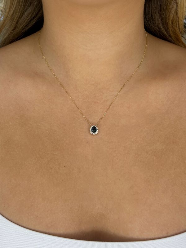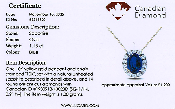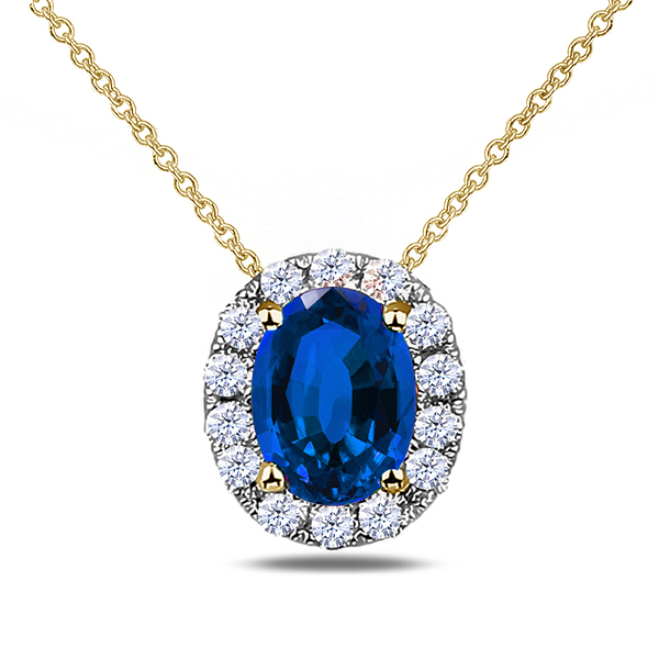 10K yellow gold halo pendant featuring a 1.13 carat oval un heated sapphire, accented by a 0.21 carat round brilliant cut melee Canadian diamonds.