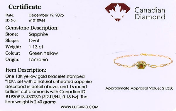 10K yellow gold bracelet featuring a 1.13 carat unheated sapphire, accented by 0.18 carat total weight round brilliant cut Canadian diamonds.