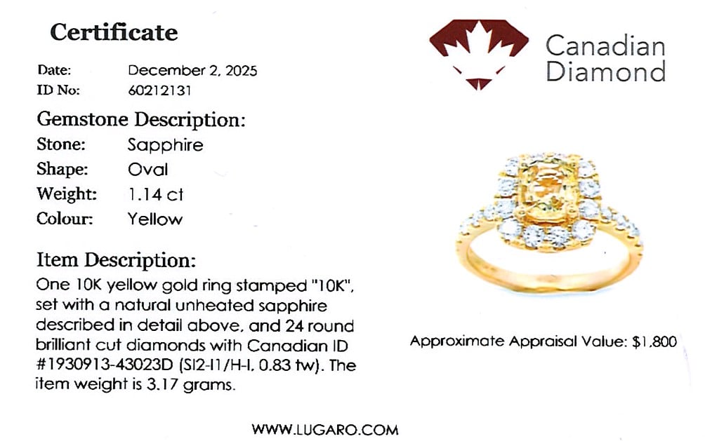 10K yellow gold ring featuring a 1.14 carat oval shaped yellow sapphire, accented by 0.83 carat total weight round brilliant cut Canadian diamonds.