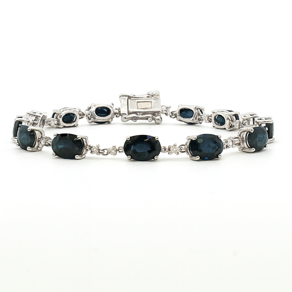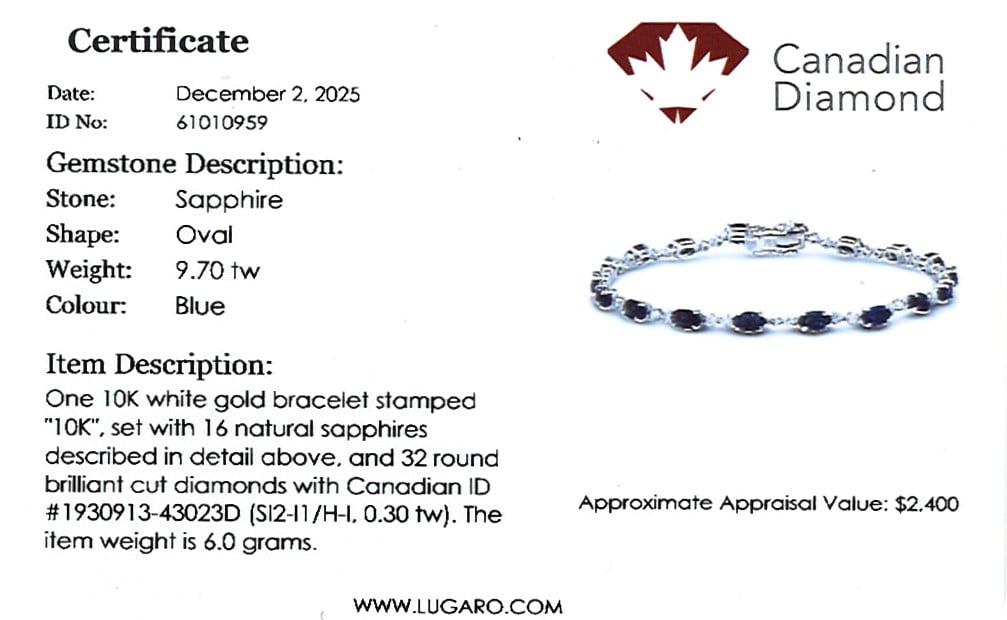 10K white gold bracelet featuring 9.70 carat total weight oval blue sapphire accented by 0.30 carat total weight round brilliant cut Canadian diamonds.