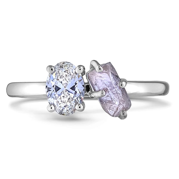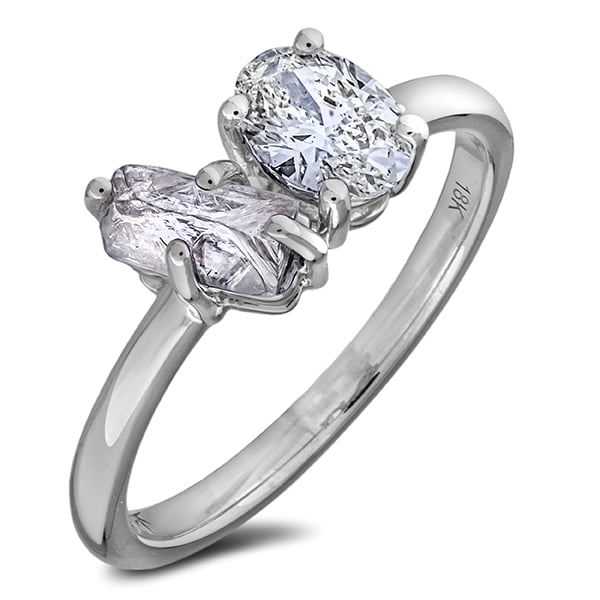 18K white gold ring featuring a 0.51 carat oval cut De Beers Forevermark diamond and a 0.89 carat rough Canadian diamond.