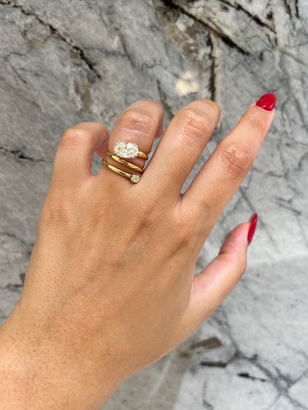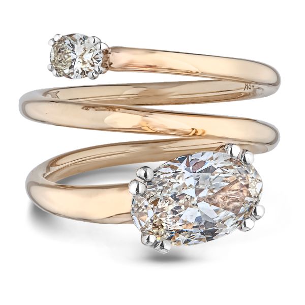 18K yellow gold De Beers Forevermark diamond modern twist you & me ring featuring a 2.0 carat oval cut De Beers Forevermark diamond and a 0.20 carat oval cut diamond.