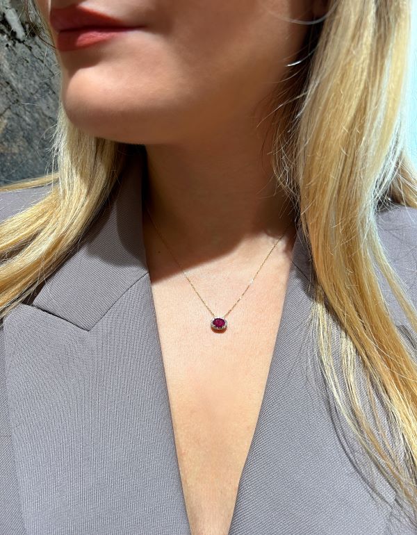 Be the first to review “Oval Cut Ruby and Diamond Halo Pendant in Yellow Gold”