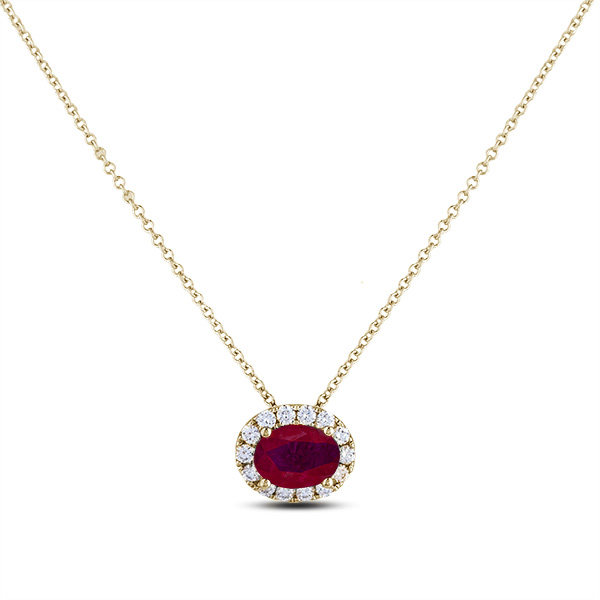 10K yellow gold ruby and diamond halo pendant featuring a 2.05 carat oval cut ruby, accented by 0.24 carat total weight round brilliant cut diamonds.
