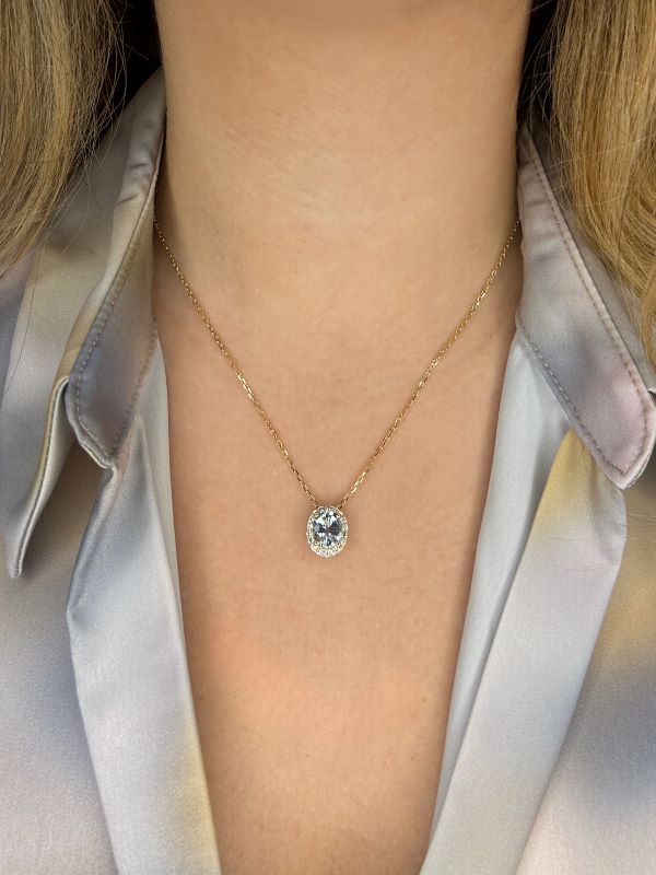 Be the first to review “Oval Halo Aquamarine and Canadian Diamond Pendant in Yellow Gold”