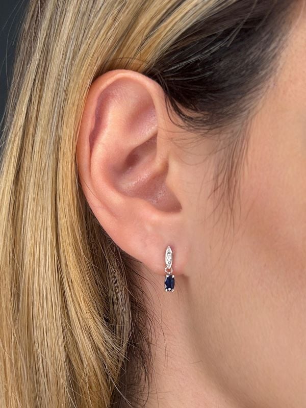 10K white gold sapphire and diamond dainty dangle earrings featuring 0.54 carat total weight oval cut sapphire, accented by 0.06 carat total weight round brilliant cut diamonds.