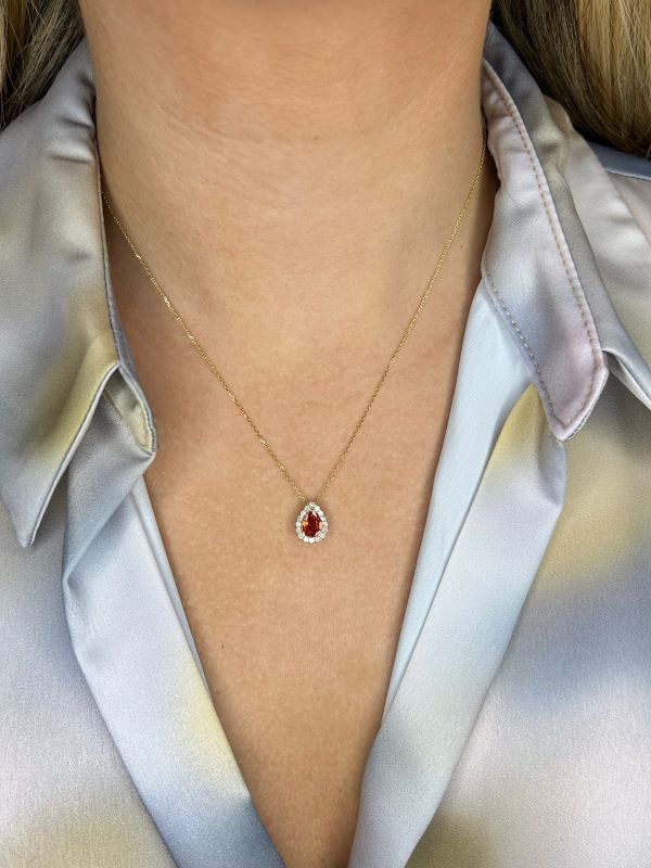 Padparadscha Color Orange Pear Cut Sapphire and Canadian Diamond Halo Pendant in Yellow Gold