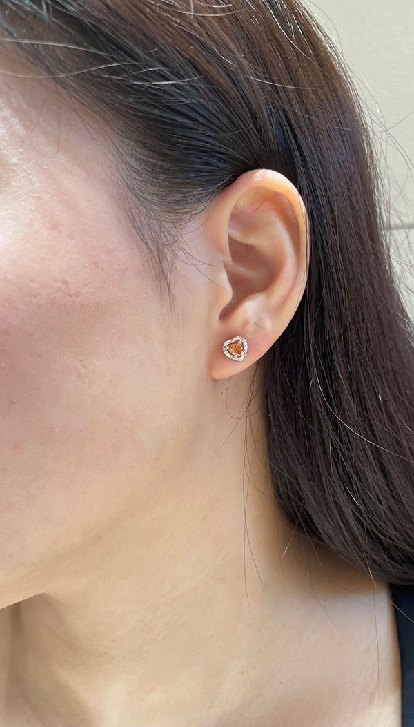 Be the first to review “Padparadscha Color Orange Sapphire and Canadian Diamond Halo Heart Stud Earrings In Yellow Gold”